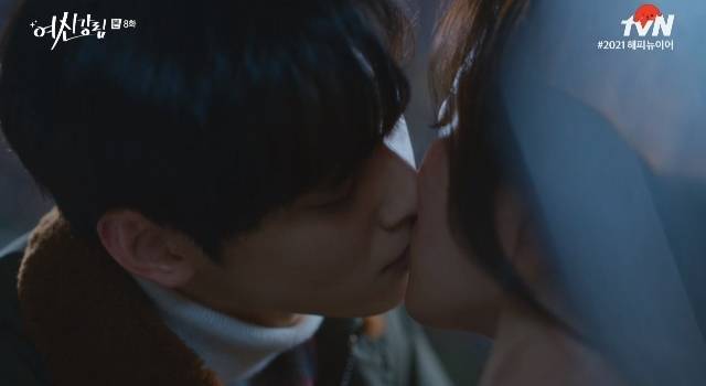 두 사람의 대화는 임주경의 민낯을 박색귀로 오해한 인물들이 쫓아오며 잠시 끊겼다. 그러나 이수호는 도망치는 임주경을 안전한 곳으로 숨겨주곤 이내 "나 강수진 안 좋아해. 내가 좋아하는 사람 너야"라고 고백했다. 이어 이수호는 민낯의 임주경에게 입맞춤을 했다. (사진=tvN '여신강림' 캡처)