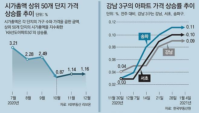 동아일보가 7일 KB부동산 리브온이 매월 발표하는 ‘선도아파트50’에 포함된 50개 단지의 지난해 12월 실거래 기록을 분석한 결과 50개 단지 중 45개 단지에서 최고가를 나타냈다. ‘선도아파트50’은 가구 수에 가격을 곱한 시가총액 상위 50개 단지를 말한다. 지난해 7월 이후 한동안 상승 폭이 줄어들었던 이 50개 단지의 시가총액 변동률은 10월부터 석 달 연속 상승 폭이 커지고 있다. 예를 들어 서초구 아크로리버파크는 12월 한 달 동안 이뤄진 거래 6건이 모두 해당 평형에서 최고가였다. 토지거래허가구역인 송파구 잠실동의 리센츠는 같은 달 18건이 거래됐다. 이 중 3일 전용면적 85m²가 23억2000만 원에, 12일 전용 59m²가 18억8000만 원에 거래되며 각각 최고가를 기록했다.
