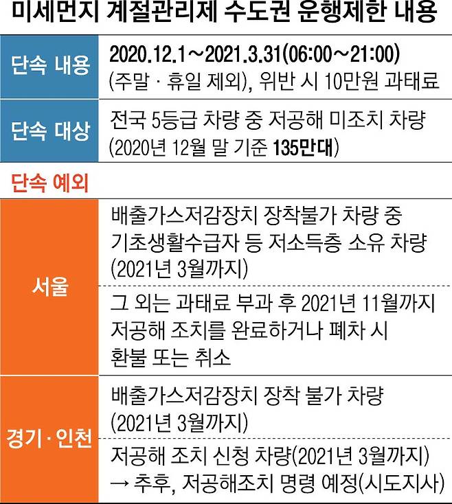 제2차 미세먼지 계절관리제(2020년 12월 1일~2021년 3월 31일) 시행 첫 한 달간 수도권에서 운행제한 차량 2만 7091대가 적발됐다.