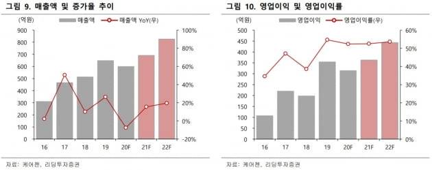 2021년 매출은 전년 대비 15% 증가한 691억원, 영업이익은 16% 늘어난 363억원, 영업이익률을 52.5%가 될 것으로 추정했다.