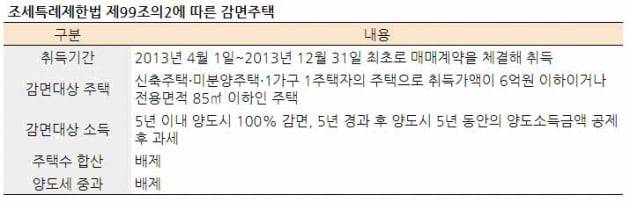 조세특례제한법에서 규정한 신축주택이나 미분양주택. 2013년 4월~12월 사이 취득한 이들 주택의 경우 양도세가 전액 감면되고 주택수를 따질 때도 합산에서 제외된다.