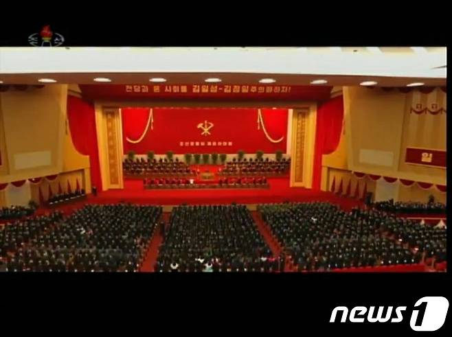 (서울=뉴스1) = 8일 오전 9시 북한 관영 조선중앙TV는 전날(지난 7일) 제8차 노동당 대회 3일 차 회의 영상을 방영했다. 대회장 내부엔 '위대한 김일성 김정일 동지는 영원히 우리와 함께 계신다'·'전 당과 온 사회를 김일성-김정일주의화화자!'라는 선전 문구가 걸려 있다. ('조선중앙TV' 갈무리)