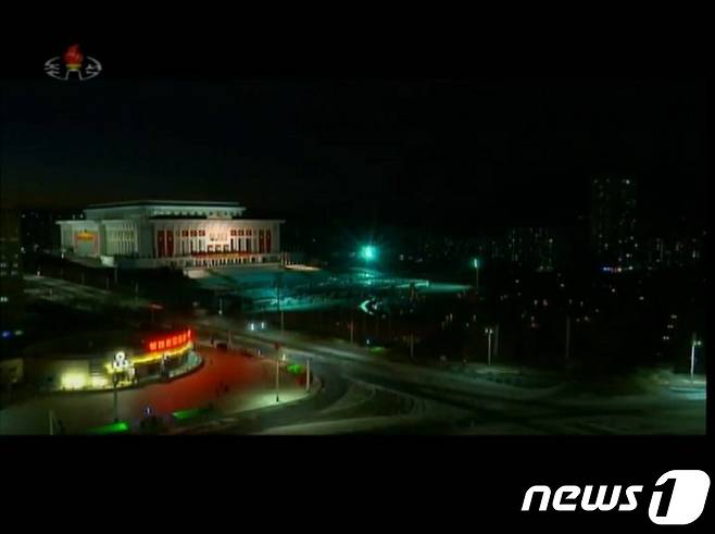 (서울=뉴스1) = 북한 관영 조선중앙TV는 전날(지난 7일) 열린 제8차 노동당 대회 3일 차 회의를 8일 오전 9시에 방영했다. 매체는 어둠이 내린 대회장 주변을 '타임랩스(저속 촬영 기법)'으로 촬영하며 대회가 늦은 밤까지 이어졌음을 시사했다. ('조선중앙TV' 갈무리)