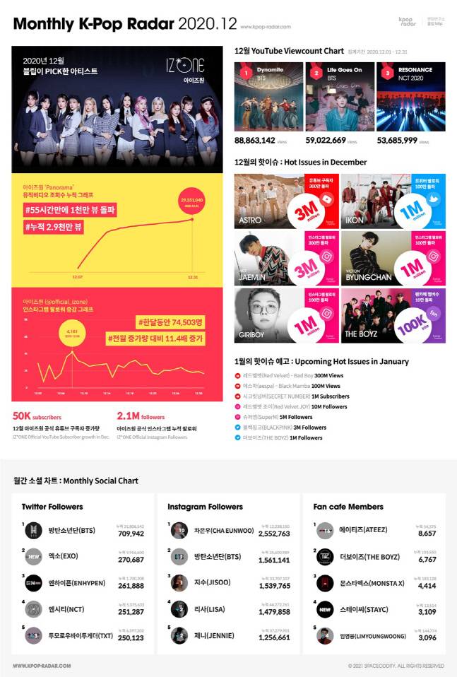 케이팝 레이더 측은 8일 "아이즈원은 SNS와 뮤직비디오, 음반까지 각 부문에서 탑 걸그룹의 면모를 어김없이 보여주었다"며 이달의 아티스트 선정 이유를 밝혔다.