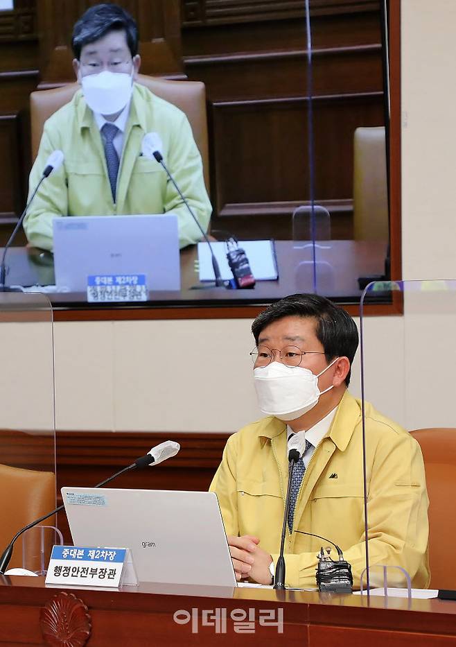 [이데일리 김태형 기자] 전해철 행정안전부 장관(중앙재난안전대책본부 2차장)이 8일 오전 서울 종로구 정부서울청사에서 열린 코로나19 대응 중앙재난안전대책본부 회의에 참석해 발언하고 있다. (사진=행안부)