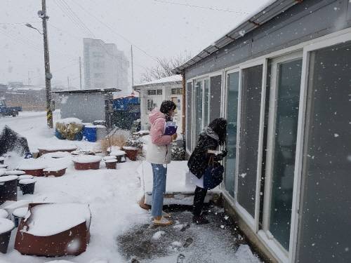 매서운 칼바람에 뒤섞여 날리는 눈발이 머리를 하얗게 뒤덮인 것도 잊은 채 방문 건강 가방에서 체온계, 혈압측정기, 혈당측정기를 꺼내고 은둔형 취약계층 어르신의 체온과 혈압·혈당을 체크한다.