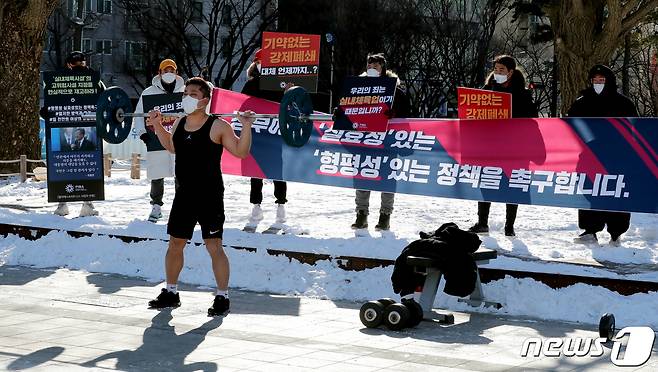 (인천=뉴스1) 정진욱 기자 = PT, 필라테스, 복싱, 헬스장 대표들이 8일 오전 인천시 남동구 인천시청 청사 앞에서 실내체육시설업 규제완화 촉구 기자회견을 한 뒤 퍼포먼스를 하고 있다. 정부는 7일 학원, 태권도장과 동일하게 아동 학습 목적을 가진 실내체육시설에 대해 교습을 허용하기로 했으나 9인 이하만 교습 허용, 헬스장은 포함되지 않아 형평성 논란이 불거졌다. 2021.1.7/뉴스1