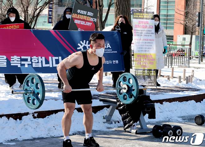 (인천=뉴스1) 정진욱 기자 = PT, 필라테스, 복싱, 헬스장 대표들이 8일 오전 인천시 남동구 인천시청 청사 앞에서 실내체육시설업 규제완화 촉구 기자회견을 한 뒤 퍼포먼스를 하고 있다. 정부는 7일 학원, 태권도장과 동일하게 아동 학습 목적을 가진 실내체육시설에 대해 교습을 허용하기로 했으나 9인 이하만 교습 허용, 헬스장은 포함되지 않아 형평성 논란이 불거졌다. 2021.1.7/뉴스1
