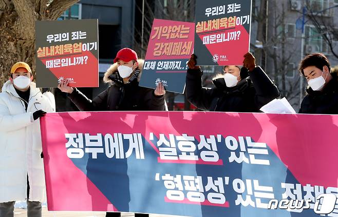 (인천=뉴스1) 정진욱 기자 = PT, 필라테스, 복싱, 헬스장 대표들이 8일 오전 인천시 남동구 인천시청 청사 앞에서 실내체육시설업 규제완화 촉구 기자회견을 하고 있다.정부는 7일 학원, 태권도장과 동일하게 아동 학습 목적을 가진 실내체육시설에 대해 교습을 허용하기로 했으나 9인 이하만 교습 허용, 헬스장은 포함되지 않아 형평성 논란이 불거졌다. 2021.1.7/뉴스1