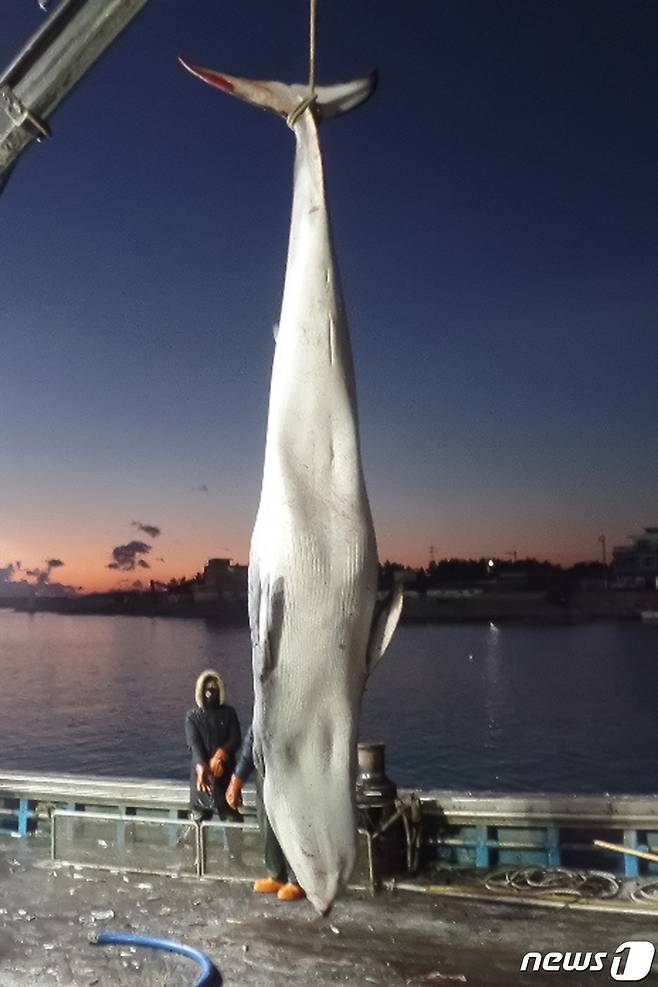(영덕=뉴스1) 최창호 기자 = 8일 오전 5시 10분쯤 경북 영덕군 남정면 부경항 약 4.8km해상에서 조업 중이던 정치망 어선(22톤) 선장 A씨가 그물에 걸려 죽은 밍크고래를 발견해 해경이 신고했다. 길이 5m4cm, 둘레2.45cm의 크기의 밍크 고래는 강구수협을 통해 6250만원에 위판됐다.(울진해양경찰서제공)2021.1.8/뉴스1