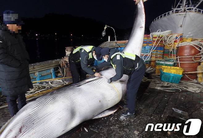 (영덕=뉴스1) 최창호 기자 = 8일 오전 5시 10분쯤 경북 영덕군 남정면 부경항 약 4.8km해상에서 조업 중이던 정치망 어선(22톤) 선장 A씨가 그물에 걸려 죽은 밍크고래를 발견해 해경이 신고했다. 길이 5m4cm, 둘레2.45cm의 크기의 밍크 고래는 강구수협을 통해 6250만원에 위판됐다.(울진해양경찰서제공)2021.1.8/뉴스1