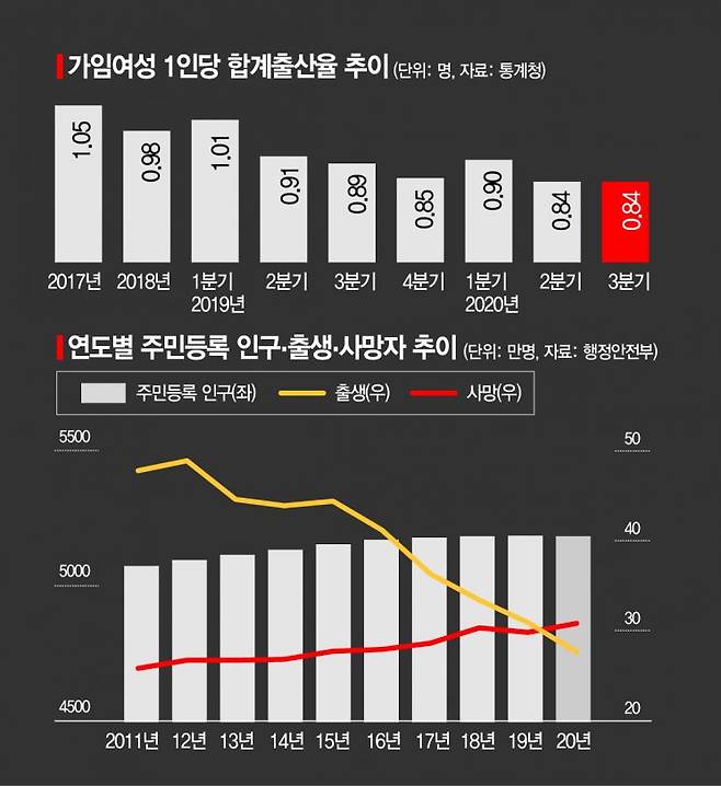 행정안전부가 이달 초 발표한 주민등록 인구 통계는 인구재앙을 눈 앞에 둔 우리나라의 현실을 여실히 보여준다. 대한민국 현대사에서 출생자보다 사망자가 더 많아 인구가 자연 감소하는 ‘데드크로스’가 처음으로 발생한 것이다. 지난해에는 신종 코로나바이러스감염증(코로나19)까지 겹치면서 출생자가 27만5815명으로 전년보다 10.7%나 감소했다. 가임 여성 1명이 평생 낳을 것으로 예상되는 자녀의 수인 합계출산율은 지난해 2·3분기 0.84명으로 세계 최저 수준이다. 한국은행 보고서에 따르면 2022년 합계출산율은 통계청이 예상한 0.72명보다 더 떨어질 전망이다.