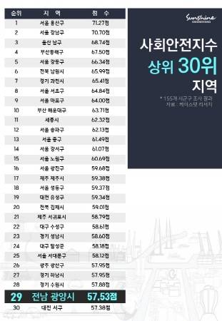 기초지자체 중 표본의 숫자가 적은 곳을 제외한 전국 155개 지자체에서 광양시는 29위로 전남에서 유일하게 상위 30위권에 포함됐으며, 특별시·광역시 소재지를 제외한 시군구 중에는 10위에 이름을 올렸다.