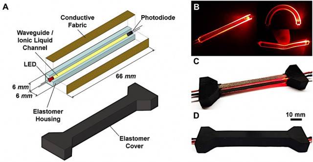이번 연구에서 개발된 센서는 쉽게 늘어나거나 휘어질 수 있는 실리콘 고무 재질로 만들어져 있는데 가는 막대 형태의 구조 내부에 속이 빈 미세한 관(microchannel)이 있고 이 관은 전기 전도성이 있는 투명한 이온 용액으로 채워져 있다. 그리고 센서 구조 외벽에는 얇은 전도성 직물이 부착돼 있다.
