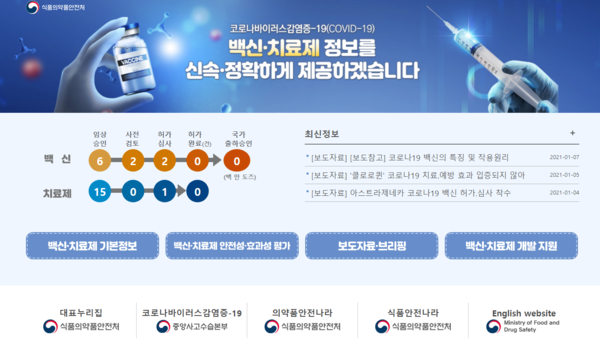 식약처, 코로나19 백신·치료제 정보 제공 사이트 개설