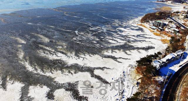 [서울경제] 서울의 최저기온이 영하 18.6도까지 떨어지며 35년 만에 가장 추운 날씨를 기록하는 등 북극발 한파가 최고조에 달한 8일 인천시 강화군 동막해변의 바닷물과 갯벌이 얼어 있다. 이번 강추위는 다음 주 중반까지 이어지다 오는 13일께 평년 수준을 회복할 전망이다./강화도=오승현기자 2021.01.08