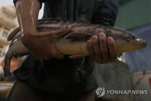 epa08925644 A man holds a fish at a wholesale fish market in Phnom Penh, Cambodia, 08 January 2021. According to data from the Ministry of Agriculture, Forestry and Fisheries, Cambodia exported over 3,500 tonnes of fishery products to international markets worth more than 8.3 million US dollars in 2020, down 74.53 percent compared to 2019. The decline was due to the Covid-19 pandemic and its effect on the import/export operations. EPA/KITH SEREY