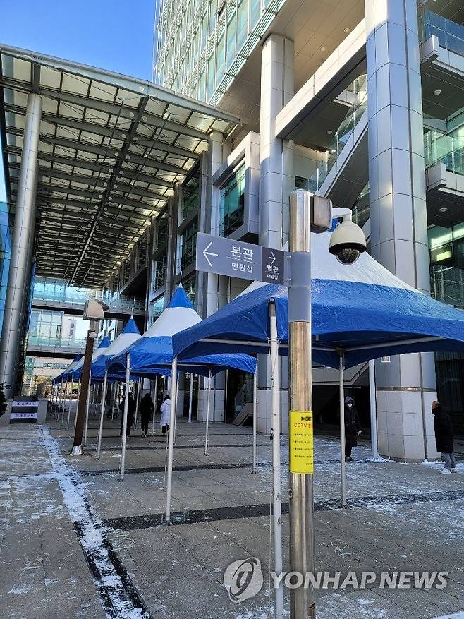 수원시청 본관과 별관 사이 광장에 전직원 진단검사를 위한 임시선별검사소가 세워졌다. 2021.1.8