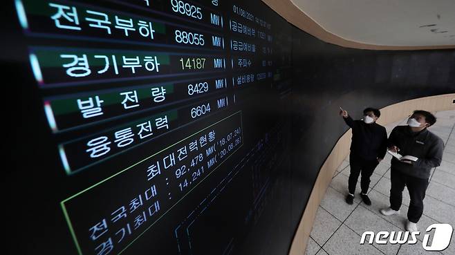 지난 7일 전국에 몰아친 한파로 난방용 전력 수요가 급증하면서 겨울철 역대 최고의 전력수요량을 보였으며 최대전력수요는 동계 기준 처음 9000만 킬로와트(kW)를 넘어서며 9020만kW를 기록했다. 산업부는 피크시간 전력공급 능력을 9898만kW까지 확보했으며 공급 예비율은 9~10% 수준으로 비교적 안정적인 수준이다.2021.1.8/뉴스1