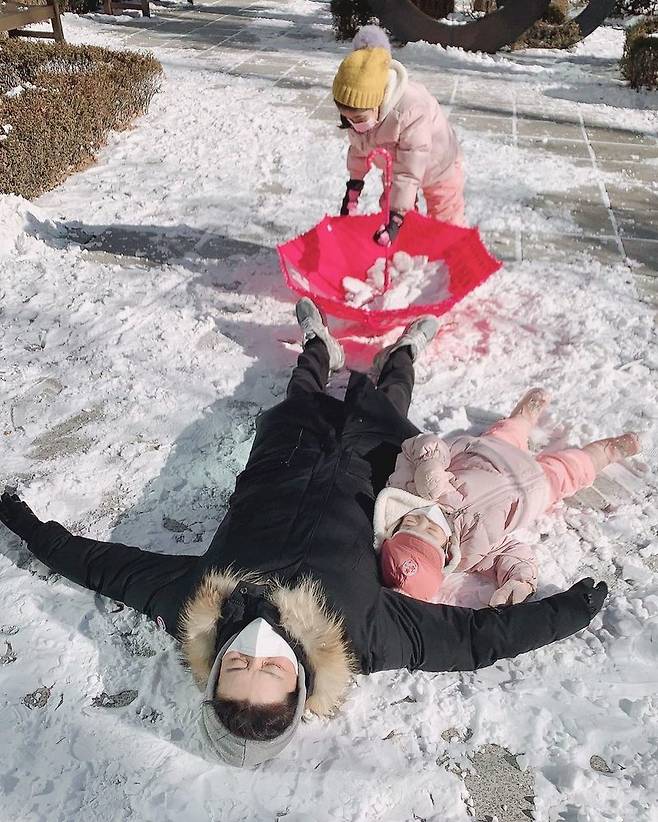 공개된 사진 속 인교진은 눈이 쌓인 길 위에서 두 딸과 장난을 치고 있다. 바닥에 누워 미소를 짓고 있는 인교진과 둘째 딸 모습에서 행복이 느껴진다.
