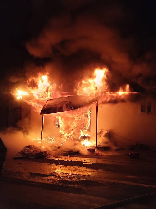 (서울=연합뉴스) 8일 오전 4시 55분께 강원 홍천군 홍천읍 하오안리 주택에서 연탄재 불티로 추정되는 불이 나 건물이 화염에 휩싸여 있다. 2021.1.8