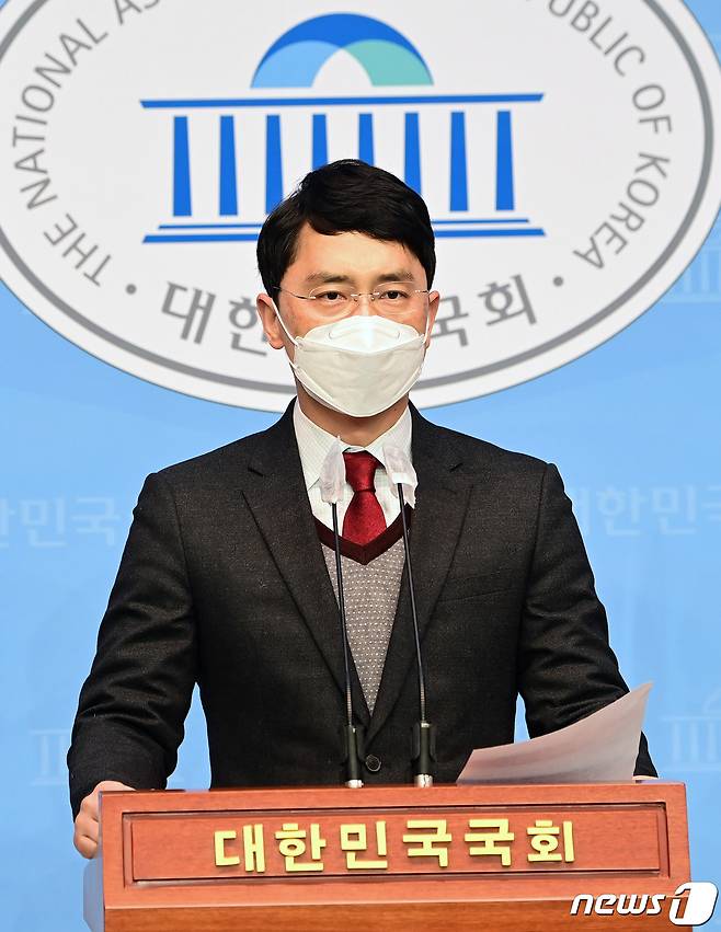 (서울=뉴스1) 박세연 기자 = 인턴 비서 성폭행 의혹으로 국민의힘을 탈당한 김병욱 무소속 의원이 8일 국회 소통관에서 기자회견을 하고 입장을 밝히고 있다.