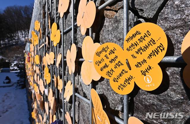 [광주(경기)=뉴시스] 김종택기자 = 위안부 피해 할머니들이 일본 정부를 상대로 제기한 손해배상 청구 소송 1심에서 승소 판결이 내려진 8일 오후 경기도 광주시 나눔의집 추모공원에 시민들이 남긴 추모 메시지가 붙어 있다. 2021.01.08.