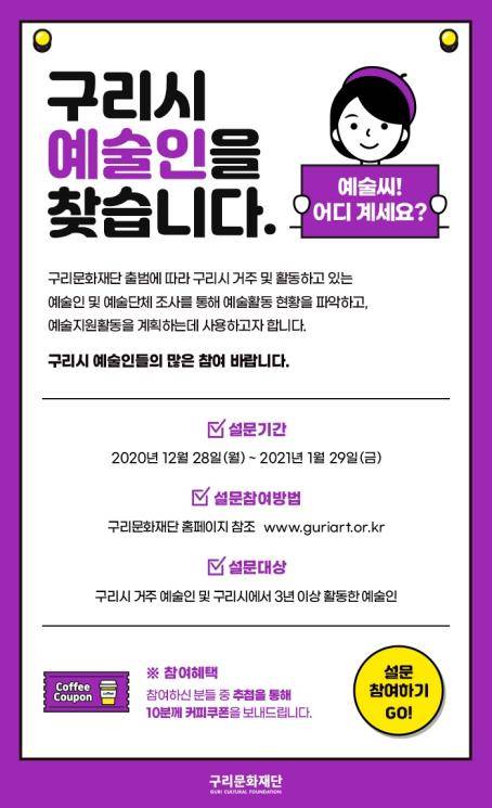 경기 구리문화재단은 29일까지 시내 거주하거나 활동 중인 예술인·단체 현황을 조사한다고 8일 밝혔다.