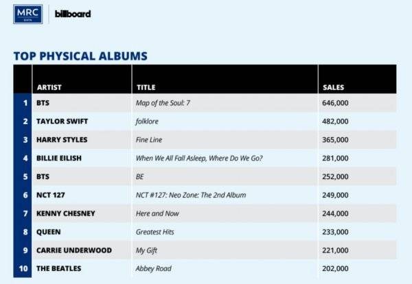 방탄소년단이 'MAP OF THE SOUL : 7'으로 2020년 한 해 미국에서 가장 많이 판매된 실물 앨범 차트 1위에 이름을 올렸다.