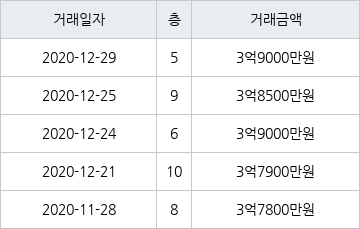 [이 기사는 조선비즈와 아티웰스가 공동으로 개발해 서비스하는 로봇 기사입니다.]국토교통부 실거래가 공개시스템에 따르면 지난 2020년 12월 29일 인천광역시 연수구 연수동 연수우성2차 5층 전용면적 84㎡형이 3억9000만원에 거래됐다.