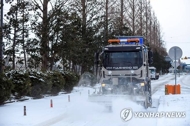 (광주=연합뉴스) 8일 공군 제1전투비행단 제설 차량이 광주 광산구 기지 주변 도로에 쌓인 눈을 치우고 있다. 공군 1전비는 광주공항 등 기지 인근 시설을 이용하는 시민 불편을 줄이고자 제설 대민지원에 나섰다. 2021.1.8 [공군 제1전투비행단 제공. 재판매 및 DB 금지]