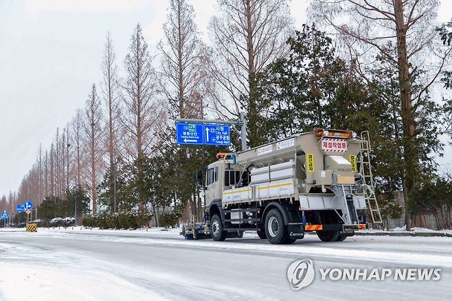 (광주=연합뉴스) 8일 공군 제1전투비행단 제설 차량이 광주 광산구 기지 주변 도로에 쌓인 눈을 치우고 있다. 공군 1전비는 광주공항 등 기지 인근 시설을 이용하는 시민 불편을 줄이고자 제설 대민지원에 나섰다. 2021.1.8 [공군 제1전투비행단 제공. 재판매 및 DB 금지]
