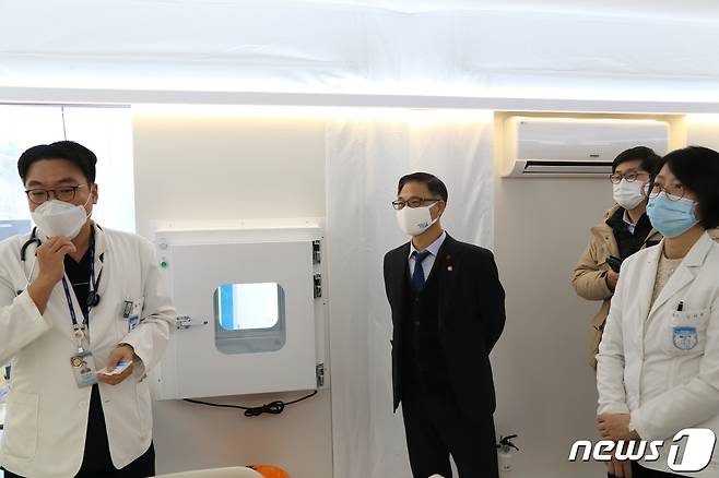 (서울=뉴스1) = 정병선 과학기술정보통신부 제1차관이 8일 오후 서울 노원구 한국원자력의학원을 방문, 김미숙 한국원자력의학원장 등과 감염병 특화 이동형 음압병동(Mobile Clinic Module) 설치현장을 둘러보며 방역실태를 점검하고 있다. (과학기술정보통신부 제공) 2021.1.8/뉴스1