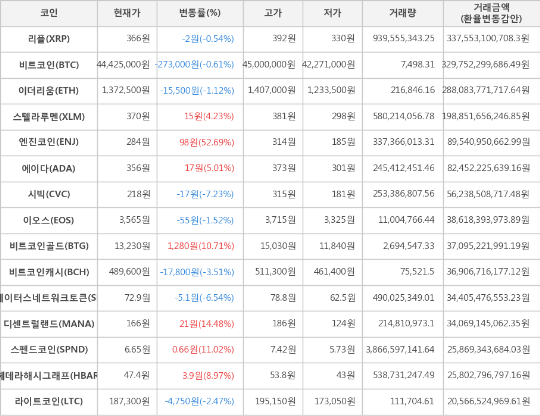 가상화폐 시세 (제공: 암호화폐 거래소 업비트)현재 암호화폐 거래소 "업비트"에 따르면 가상화폐 대장 격인 비트코인의 시세는 전일 대비 -273,000원(-0.61%) 하락한 44,425,000원에 거래되고 있다.