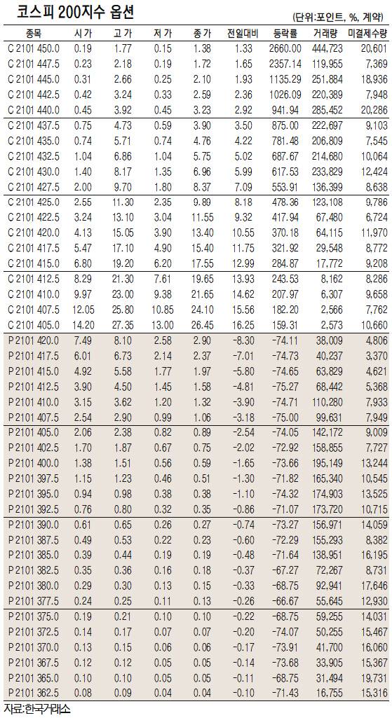 8일 한국거래소에 따르면 코스피 200지수 옵션 중 콜옵션 행사가격 450.0인 종목의 상승률은 2,660.0%에 달했다. 행사가격이 447.5인 종목도 2,357.14%나 급등했다. 이외에도 445.0(1,135.29%), 442.5(1,026.09%), 440.0(941.94%) 종목이 높은 수익률을 기록한 것으로 나타났다.