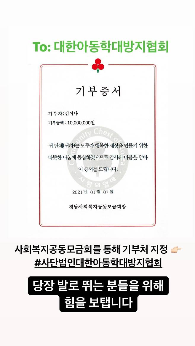 기부 증서에 따르면 김이나는 경남사회복지공동모금회를 통해 사단법인 대한아동학대방지협회에 1천만원을 기부했다.