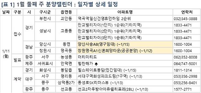 부동산 정보업체 부동산114에 따르면 2021년 1월 둘째 주에는 전국 27개 단지에서 총 1만8652가구(일반분양 1만4279가구)가 분양을 시작한다.