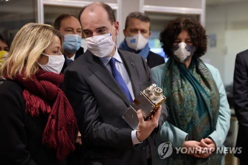epa08925812 (L-R) French Ecological Transition Minister Barbara Pompili, French Prime Minister Jean Castex, French Higher Education, Research and Innovation Minister Frederique Vidal, visit the offices of France-based space company Exotrail, in the South of Paris suburban city of Massy, France, 08 January 2021. The company designs, develops, and operate mobility solutions allowing small satellite to move in space. Exotrail announced on December 16, 2020 the support of French Armament General Directorate, through the Defence Innovation Agency, to develop technologies allowing small satellites to operate in geostationary orbit. EPA/THOMAS COEX / POOL MAXPPP OUT