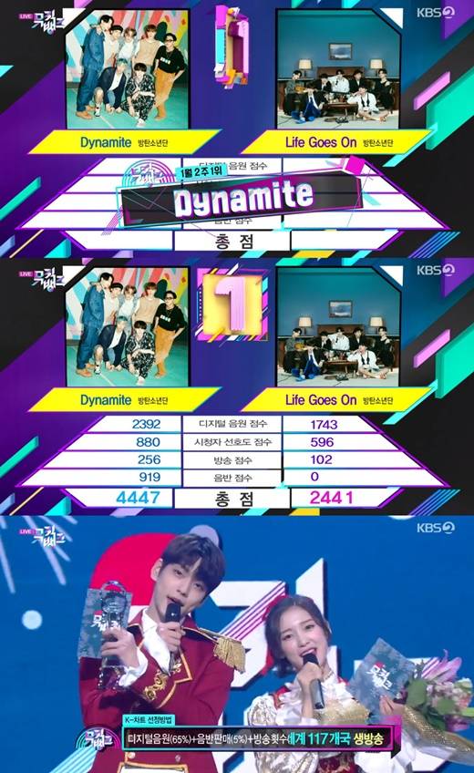 특히 주목할 만한 점은 방탄소년단의 신곡 '다이너마이트'와 '라이프 고즈 온'이 동시에 1위 후보에 들며, 스스로와 1위 대결을 펼치게 된 것.