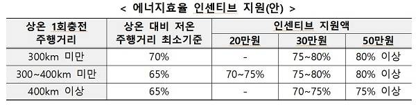 또한 동절기 성능 저하 문제 개선을 위해 상온(23℃) 대비 저온(-7℃) 주행거리가 우수한 에너지 고효율 차량에 인센티브를 부여(최대 50만원)하고 수소차의 경우, 보급 초기(2018년 넥쏘 출시)인 점을 감안, 보조금 지원단가를 유지(국비 2250만원)한다.