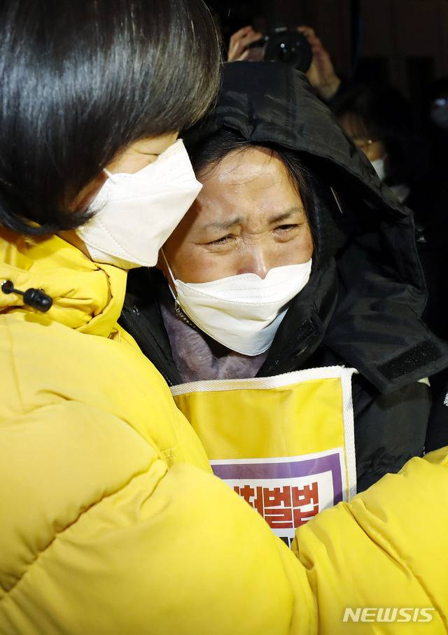 [서울=뉴시스]최동준 기자 = 강은미 정의당 원내대표, 고 김용균 씨 어머니 김미숙 씨가 8일 서울 여의도 국회 본관 앞에서 열린 중대재해기업처벌법 제정 촉구 단식농성 해단식에서 포옹하고 있다. 2021.01.08. photocdj@newsis.com