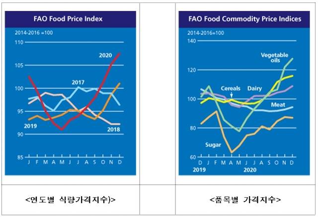 농림축산식품부는 8일 국제연합식량농업기구(FAO·Food and Agriculture Organization of the United Nations)를 인용해 지난달 세계식량가격지수가 전월보다 2.2% 상승한 107.5포인트(p)를 기록했다고 밝혔다.