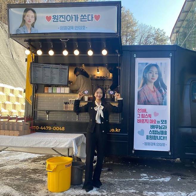 공개된 사진에는 검은 커피차 앞에서 행복한 듯 브이 포즈를 취하고 있는 원진아의 모습이 담겼다. 매서운 추위에도 훈훈한 미소를 보이며 러블리한 비주얼을 뽐냈다.