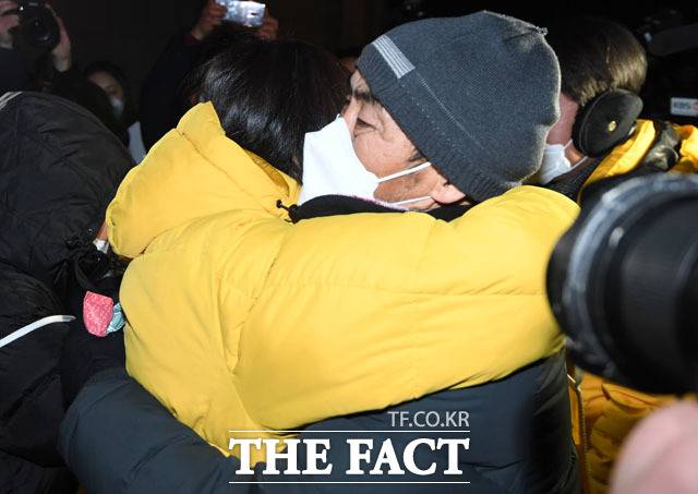 [더팩트ㅣ국회=남윤호 기자] 강은미 정의당 원내대표(왼쪽)와 고 김용균 씨 어머니 김미숙 씨가 8일 서울 여의도 국회 본관 앞에서 열린 중대재해기업처벌법 제정 촉구 단식농성 해단식에서 포옹하고 있다.