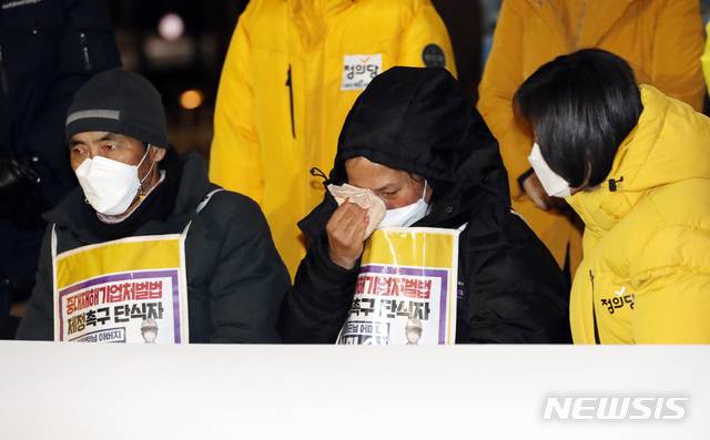 [서울=뉴시스]최동준 기자 = 고 이한빛 PD 아버지 이용관 씨, 고 김용균 씨 어머니 김미숙 씨가 8일 서울 여의도 국회 본관 앞에서 열린 중대재해기업처벌법 제정 촉구 단식농성 해단식에서 발언을 듣고 있다. (공동취재사진) 2021.01.08. photo@newsis.com
