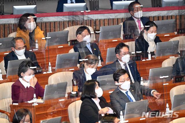 [서울=뉴시스]최동준 기자 = 강은미 정의당 원내대표를 비롯한 정의당 의원들이 8일 오후 서울 여의도 국회에서 열린 본회의에서 중대재해 처벌 등에 관한 법률안 통과 결과를 지켜보고 있다. (공동취재사진) 2021.01.08. photo@newsis.com