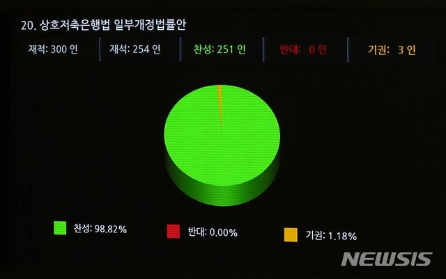 [서울=뉴시스]최동준 기자 = 8일 오후 서울 여의도 국회에서 열린 본회의에서 상호저축은행 일부개정법률안이 찬성 251표, 반대 0표, 기권 0표로 통과되고 있다. (공동취재사진) 2021.01.08. photo@newsis.com