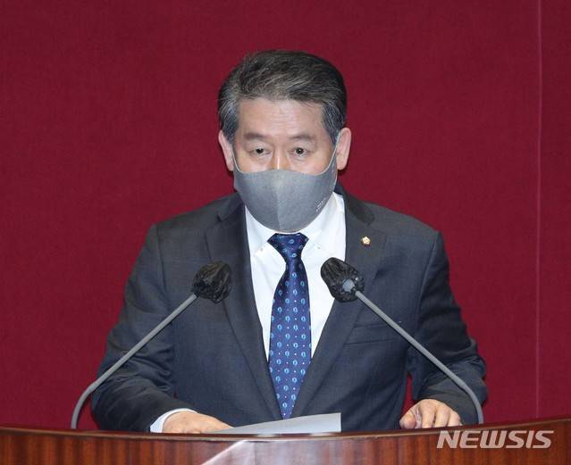 [서울=뉴시스]최동준 기자 = 국회 정보위원회 위원장으로 선출된 김경협 더불어민주당 의원이 8일 오후 서울 여의도 국회에서 열린 본회의에서 당선 인사를 하고 있다. (공동취재사진) 2021.01.08. photo@newsis.com
