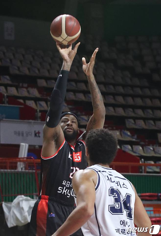(부산=뉴스1) 여주연 기자 = 8일 오후 부산 사직실내체육관에서 열린 '2020~2021 현대모비스 프로농구' 부산KT와 전주KCC 경기에서 KT 알렉산더가 슛하고 있다. 2021.1.8/뉴스1