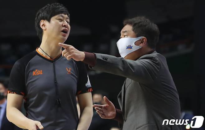 (부산=뉴스1) 여주연 기자 = 8일 오후 부산 사직실내체육관에서 열린 '2020~2021 현대모비스 프로농구' 부산KT와 전주KCC 경기에서 KCC 전창진 감독이 항의하고 있다. 2021.1.8/뉴스1